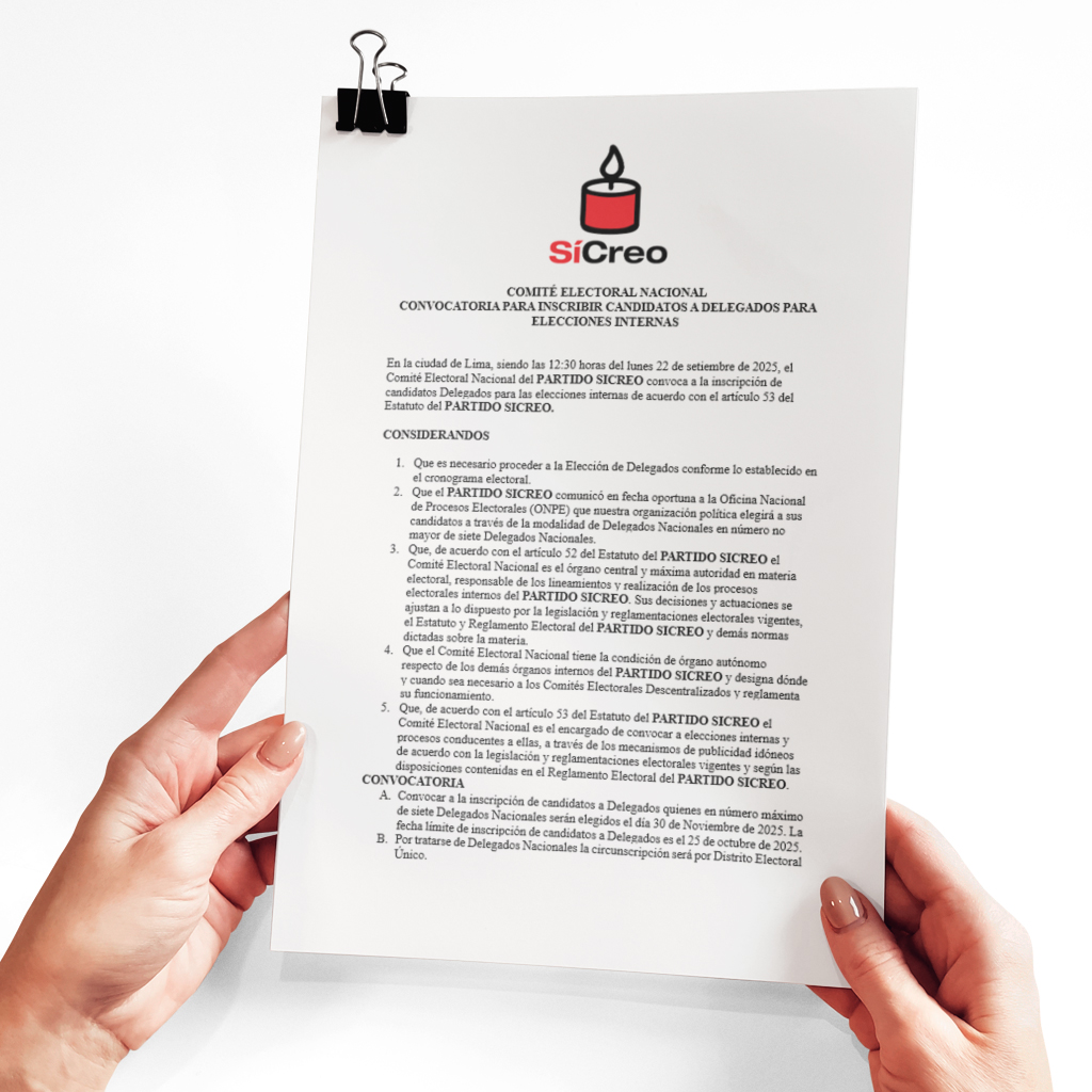 En la ciudad de Lima, siendo las 12:30 horas del lunes 22 de setiembre de 2025, el Comité Electoral Nacional del PARTIDO SICREO convoca a la inscripción de candidatos Delegados para las elecciones internas de acuerdo con el artículo 53 del Estatuto del PARTIDO SICREO. CONSIDERANDOS CONVOCATORIA Para la recepción y procesamiento de documentación […]